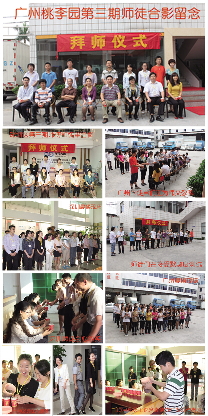 尊师重教的感恩文化,是良程吉运人发自内心的情感文化,随着一颗颗桃李树的茁壮成长,桃李园地将呈现一片枝繁叶茂,果实累累的新气象,10月21日,11月3日,第三期桃李园拜师仪式分别在深圳和广州的晨操现场进行.也许是沉积在内心的深情厚谊平时无以言表,所有的师徒都以极高的积极性早早的赶到现场,笑容至始至终洋溢在眉目间.期间主持人通过游戏对每组师徒的默契度进行了测试,大家都不甘落后,以最敏捷的思维和默契应对考验,场面温馨自然,同时在场见证的观众们也不时给予祝福的掌声,人生的精彩在于拼搏,人生的快乐来自关怀!用沟通的心灵和满腔的热忱我们携手共进!我们就是这样成长,获得超越!